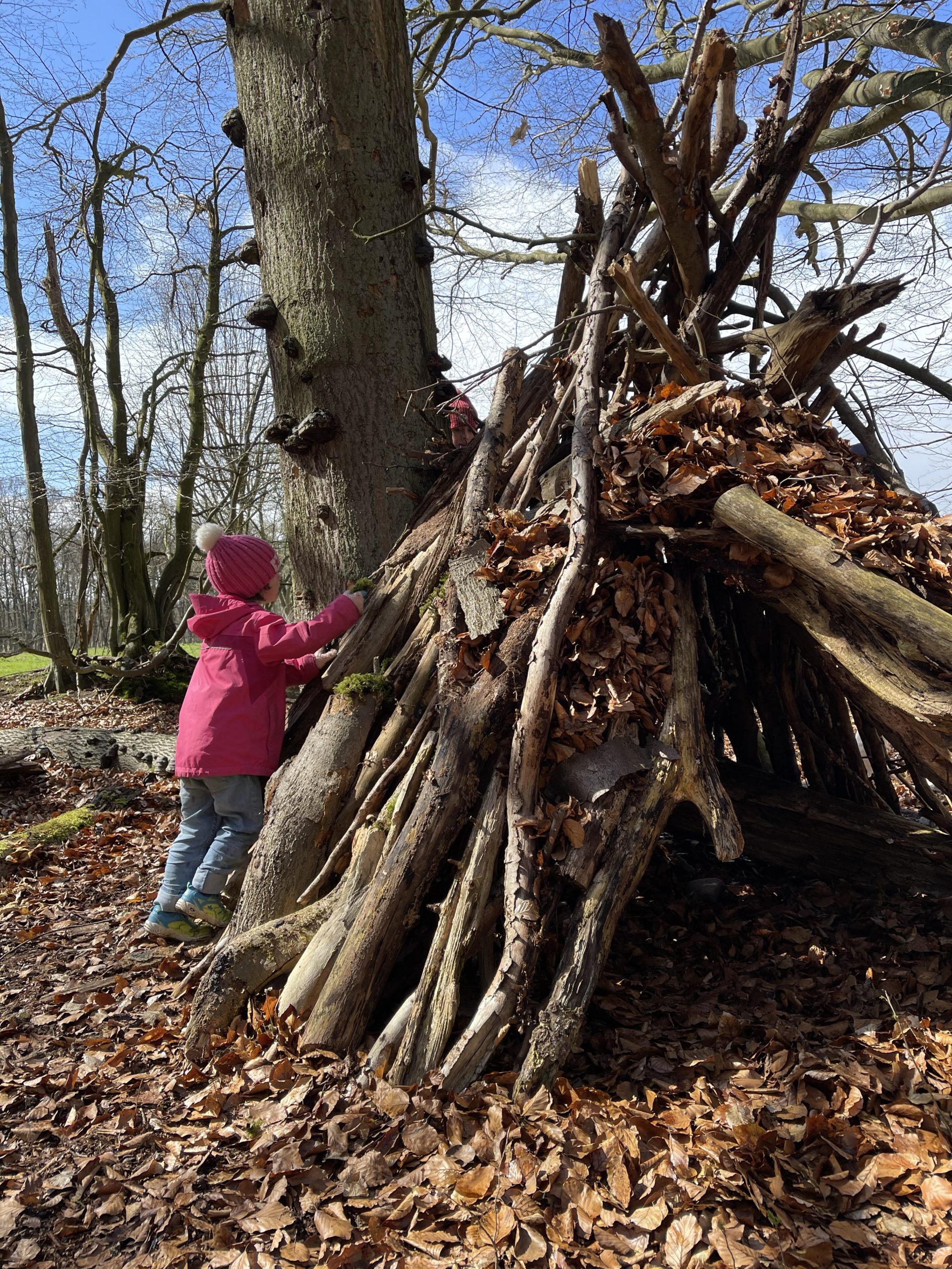 Nach der ganzen Sucherei (und nach ausgiebigem Ausschlafen) genossen wir den letzten Tag im Wald. Wir bauten gemeinsam ein Tipi und liefen über schmale Waldwege zu einem Waldbach und einer Brücke. Die Kinder warfen Stöcke ins Wasser, kletterten über Baumstämme und wuselten durchs Laub. Auch an diesem Tag hatten wir -wie schon die Zeit davor- fast jedes Wetter. Von Sonne über Regen, Hagel und Wind bis hin zu Schnee. Richtiges Aprilwetter und eine schöne Auszeit zum Monatsbeginn.