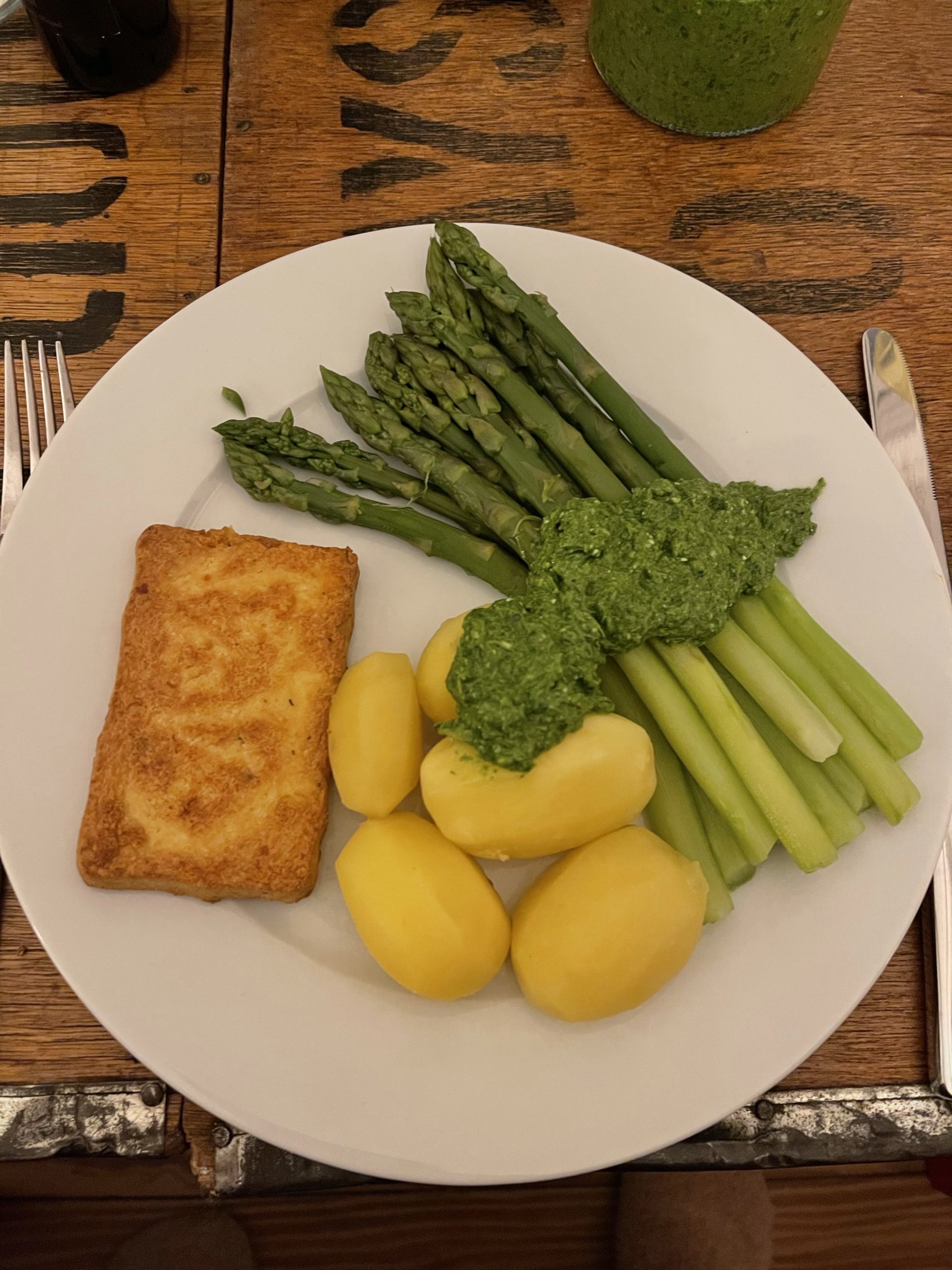 - grüner Spargel mit Kartoffeln, Bärlauchpesto und Tofu-Bratfilet