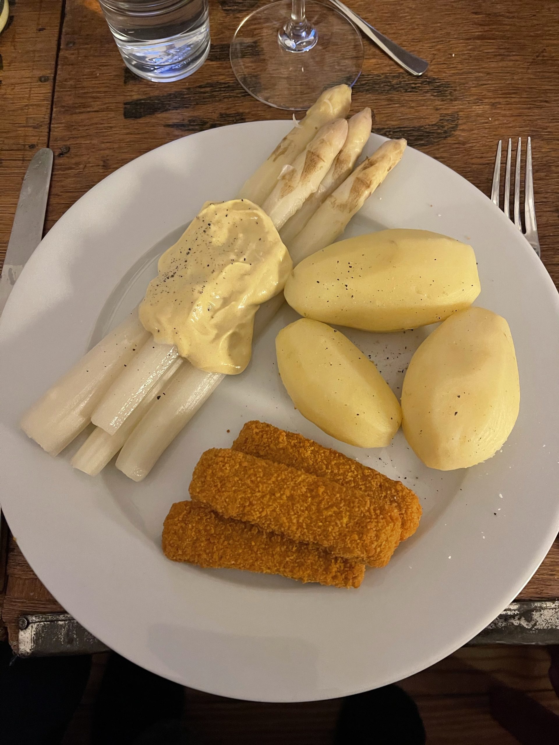 - weißer Spargel mit Kartoffeln, Sauce Hollandaise und veganen Fischstäbchen
