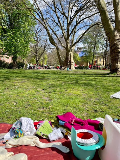 Am 23. April gaben Melanie und ich wieder unseren Kombi-Kurs Stoff.Windel.Frei. in der Elternschule Altona in Hamburg. Weil das Wetter schön war, bauten wir unsere Kursunterlagen im Park vor der Elternschule auf. Wir hatten die Teilnehmer vorab gebeten, Picknickdecken mitzubringen. Was wir nicht wussten und daher auch im Vorfeld nicht berücksichtigen konnten, war ein türkischer Feiertag, der auf genau dieses Datum fiel. (Der 23. April ist der Feiertag der Nationalen Souveränität und des Kindes.) Schräg gegenüber der Elternschule befindet sich die Türkische Gemeinde in Hamburg und Umgebung e.V., die im anderen Teil des Parks ein Kinderfest vorbereitet und aufgebaut hatte. Anfangs konnten wir den Kurs noch gut draußen halten, mussten ihn aber schließlich nach drinnen (in die Räume der Elternschule) verlegen, weil die Festmusik zu laut war. Unser Kurs kam trotzdem wieder so gut an, dass wir ihn dieses Jahr noch ein zweites Mal anbieten möchten. Den Termin dafür müssen wir allerdings noch finden.