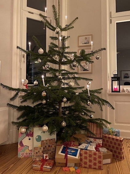 Ich bin kein Freund von Weihnachtsbäumen (siehe hier meinen Blogartikel dazu). Aber dieses Jahr hatten wir spontan einen. Am Morgen des 23.12. entdeckte mein Mann, dass die Tannenbäume des St. Pauli Weihnachtsmarktes verschenkt oder gegen freiwillige Spende abgegeben werden. Ein Secondhand-Baum quasi, der schon 3 Wochen als Deko dort rumstand und nun nicht mehr gebraucht wird. Mit der Großen radelte er dort hin und holte uns einen Baum. Gemeinsam bauten wir ihn am 24.12. auf und dekorierten ihn. Ich kümmerte mich zusätzlich den ganzen Tag ganz entspannt um unser Weihnachtsessen: vegane Köttbullar mit Rahmsauce, Rotkohl und Kartoffelstampf mit Karotten. Zum Nachtisch: selbstgemachtes Vanilleeis mit heißen Himbeeren.