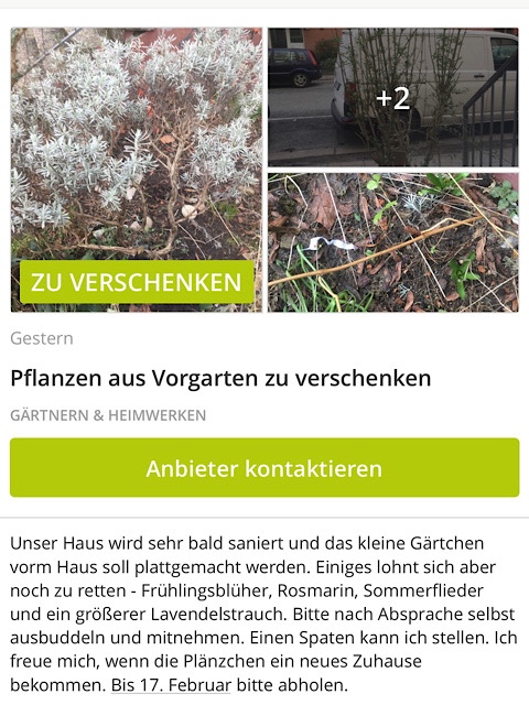 Unsere eigenen Pflanzen im Innenhof hatten wir ja in buchstäblich letzter Sekunde gerettet. Aber wir haben auch noch unseren Kiezgarten vor dem Haus: Ein Hochbeet und zwei andere bepflanzte Flächen. Die Beete sind groß und ab und zu geht mal was kaputt oder wird geklaut. Daher war ich ganz froh, als ich auf der Plattform nebenan.de einen Post mit „Pflanzen zu verschenken“ entdeckte. So konnte ich dort einige Pflanzen retten, die wegen Renovierungsarbeiten platt gemacht worden wären. Dank Fahrradanhänger war der Transport ein paar Straßen weiter bis zu uns schnell erledigt. Die Pflanzen scheinen sich in der neuen Umgebung wohl zu fühlen. Und ich bin gespannt, wie sich die Beete im Laufe des Jahres weiterentwickeln.