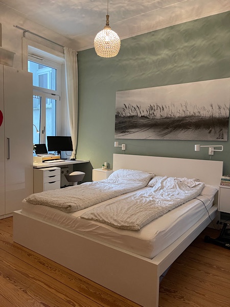 Wir hatten eine Idee: Wir schenken der Familie den schmalen Schrank und die 50 cm tiefen PAX-Schränke und ersetzen diese durch vier 35 cm tiefe Schränke. Die ganzen Sachen, die in und auf den Schränken verstaut waren, wollten wir in Kisten unter unser Bett packen. Dafür war unser Bett aber zu niedrig und wir verkauften es über ebay Kleinanzeigen. Für das neue, höhere Bett kauften wir nach Jahren auch endlich mal eine neue Matratze. Wir nutzten die Gelegenheit für einen Wandanstrich im Schlafzimmer und optimierten meinen Schreibtischbereich. Ganz nebenbei hatten wir noch neue Kissenbezüge für unser Sofa gefunden.