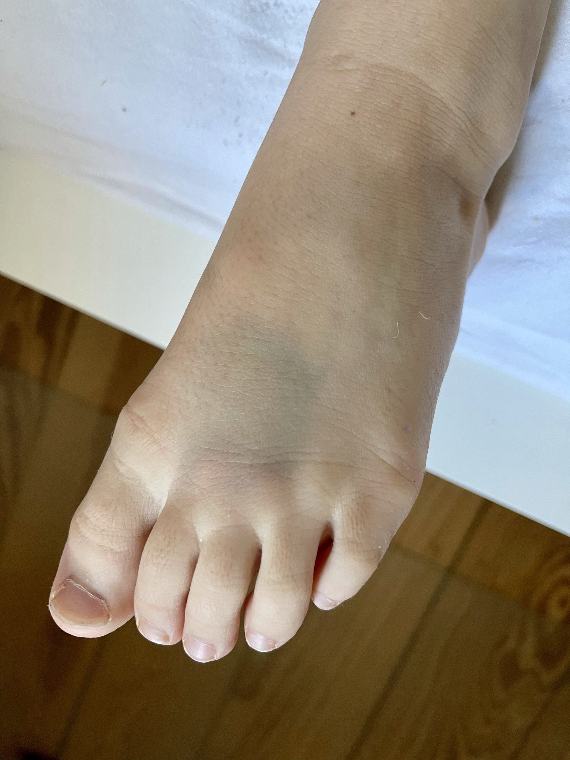 Bei einem Ausflug in den Wald Anfang Februar wollte Kind Nr. 1 einen großen Holzblock als Sitzbank für ein Tipi verwenden. Allerdings fiel dieser Holzstamm um und auf ihren Fuß. Resultat: Schmerzen, anfangs dicker Fuß und ein blauer Fleck mit ca. 3 cm Durchmesser. Nach wenigen Tagen humpeln und ohne Schuhe war es wieder okay.