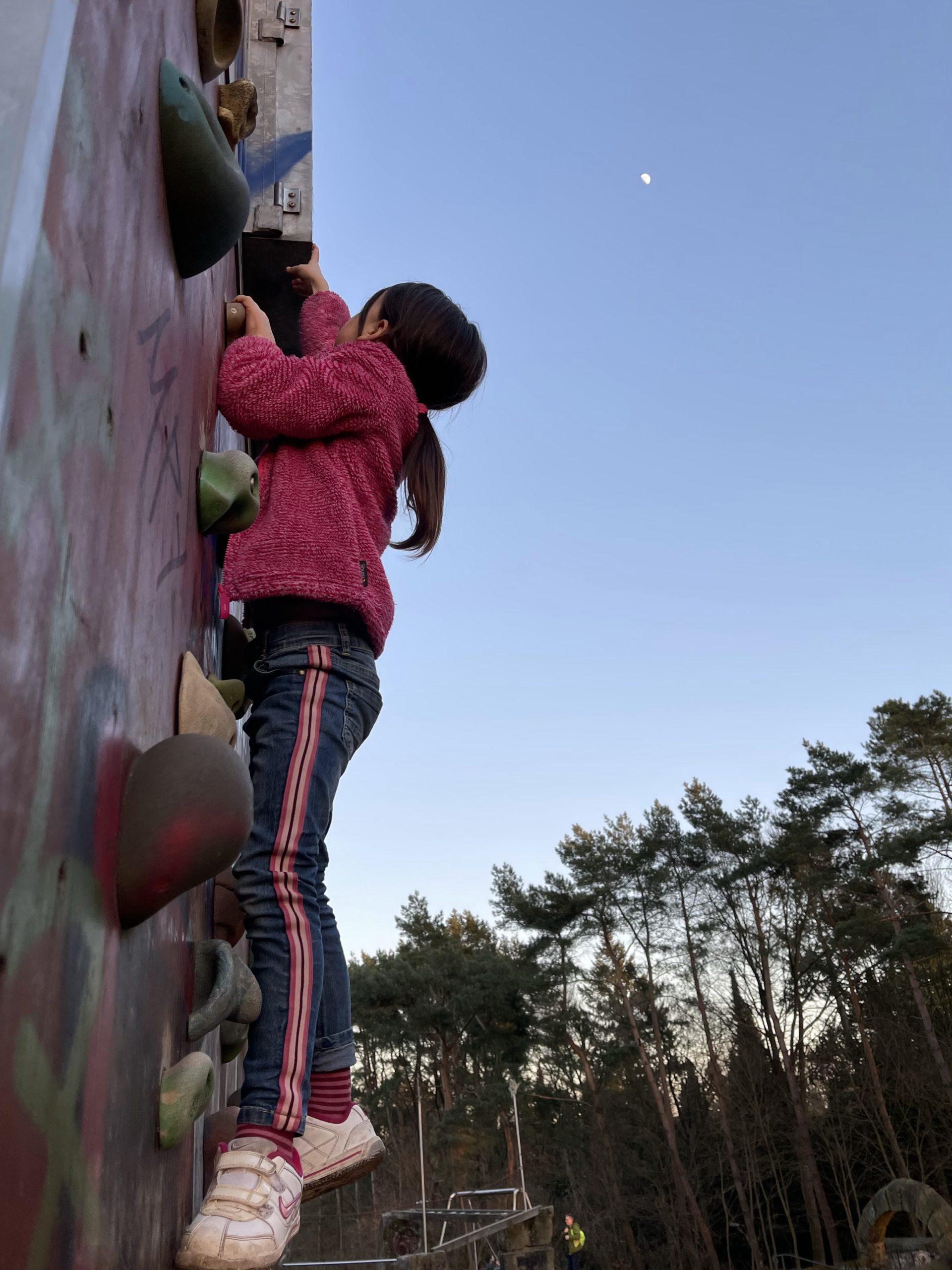 - Kind Nr. 1 nutzt die Kletterwand auf einem neu entdeckten Spielplatz
