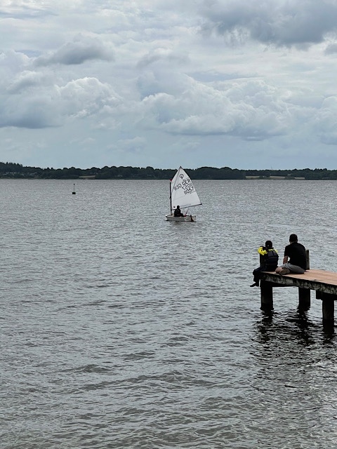 - Mein Mann und Kind Nr. 1 sitzen auf dem Steg und schauen der anderen Gruppe zu.