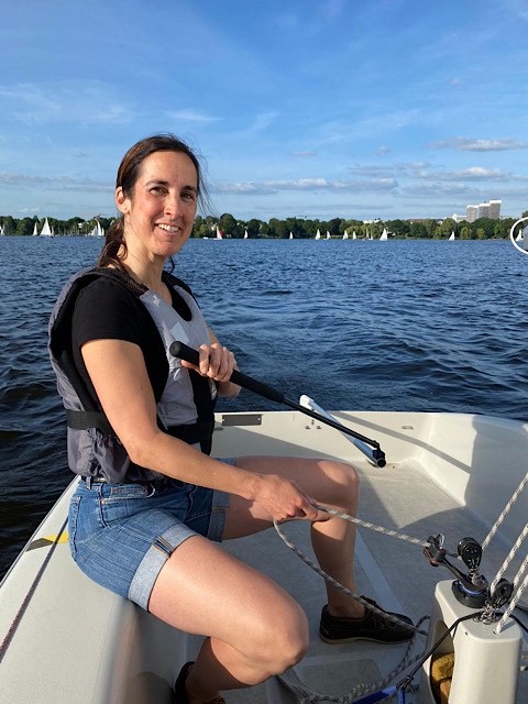 Die Mutter der Familie, mit der wir uns die Hütte geteilt haben, hatte mir erzählt, dass der Segelclub auch für Erwachsene Segelkurse anbietet. Sie selbst hatte in der Woche vor dem Freizeitwochenende eine Schnupperstunde genommen. Sie lud mich ein, am Dienstag doch auch zum Club zu kommen, um das mit dem Segeln mal auszuprobieren. Gesagt, getan. Aufgrund von Segelprüfungen stand der Lehrer allerdings nicht für uns Erwachsene zur Verfügung. Glücklicherweise ist mein Mann ein erfahrener Segler und er durfte für uns den Segellehrer machen. So war ich zum ersten Mal in meinem Leben segeln, und das auf der Alster! Und was soll ich sagen, es hat mir Spaß gemacht! Ich werde dort nach den Ferien jeweils dienstags einen Segelkurs besuchen. Und dann die ganzen Segelbegriffe wieder neu lernen, weil ich sie inzwischen wahrscheinlich schon vergessen habe 🙂