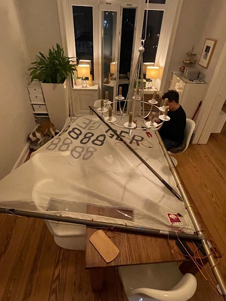 - Mein Mann bereitet das Segel für die kommende Saison vor – auf unserem Esstisch.