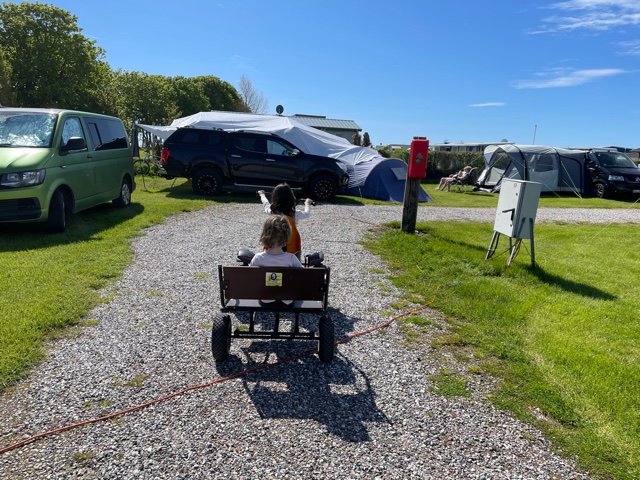 - Die Kinder haben sich einen Kart mit Anhänger ausgeliehen.