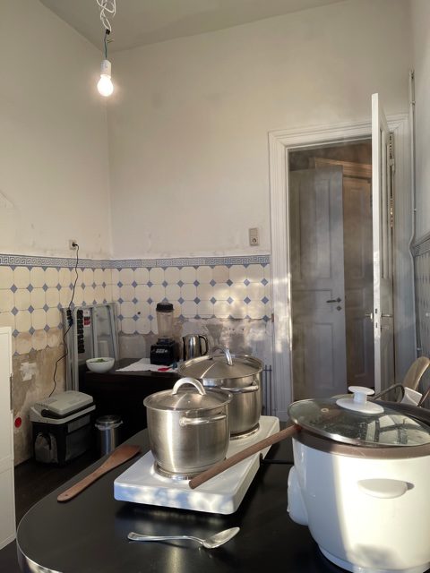 Um für die Übergangszeit wenigstens kochen zu können, kaufte ich eine Doppelkochplatte. Wir richteten eine provisorische Kochecke in der alten Küche ein. Der Bruder meines Mannes hatte uns eine elektrische Kühlbox ausgeliehen, der Inhalt unseres Gefrierfachs kam vorübergehend bei einer Nachbarin unter und den Rest der zu kühlenden Sachen stellten wir auf den Balkon. Wir hatten in diesem Fall echt Glück, dass der Mai so kalt war.