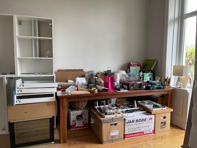 Da in Hamburg Einrichtungshäuser und Baumärkte weiterhin geschlossen waren, bestellten wir ein paar Küchenspülen und Armaturen im Internet. Und weil diese erst Ende des Monats geliefert wurden und wir für den Anschluss des Durchlauferhitzers und der Hebeanlage einen Profi brauchen, mussten wir (und müssen immer noch) für Wasser jedesmal ins Bad laufen. Dort spülen wir auch unser Geschirr in der Badewanne. Griffe fehlen auch noch an den Schränken der neuen Küche. Wir haben uns noch nicht entschieden, welche wir dran machen wollen. Ich freue mich auf jeden Fall darauf, wenn die Küche wirklich fertig ist.