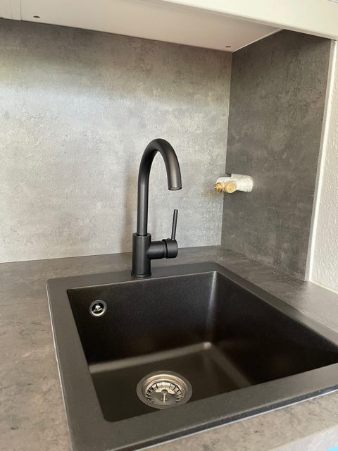 - Die Spüle ist drin, der Wasseranschluss fehlt allerdings noch.