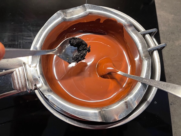 1. Die Schokolade mit einem Messer grob hacken und über einem Wasserbad schmelzen.