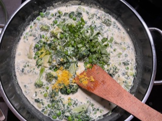 7. Nun den TK-Spinat dazu geben und den Topf mit einem Deckel schließen, damit er schneller auftaut. Nach ein paar Minuten die TK-Erbsen ebenfalls in den Topf schütten. ODER den frischen Spinat und die TK-Erbsen gleichzeitig in den Topf geben und die Spinatblätter etwas zusammenfallen lassen.