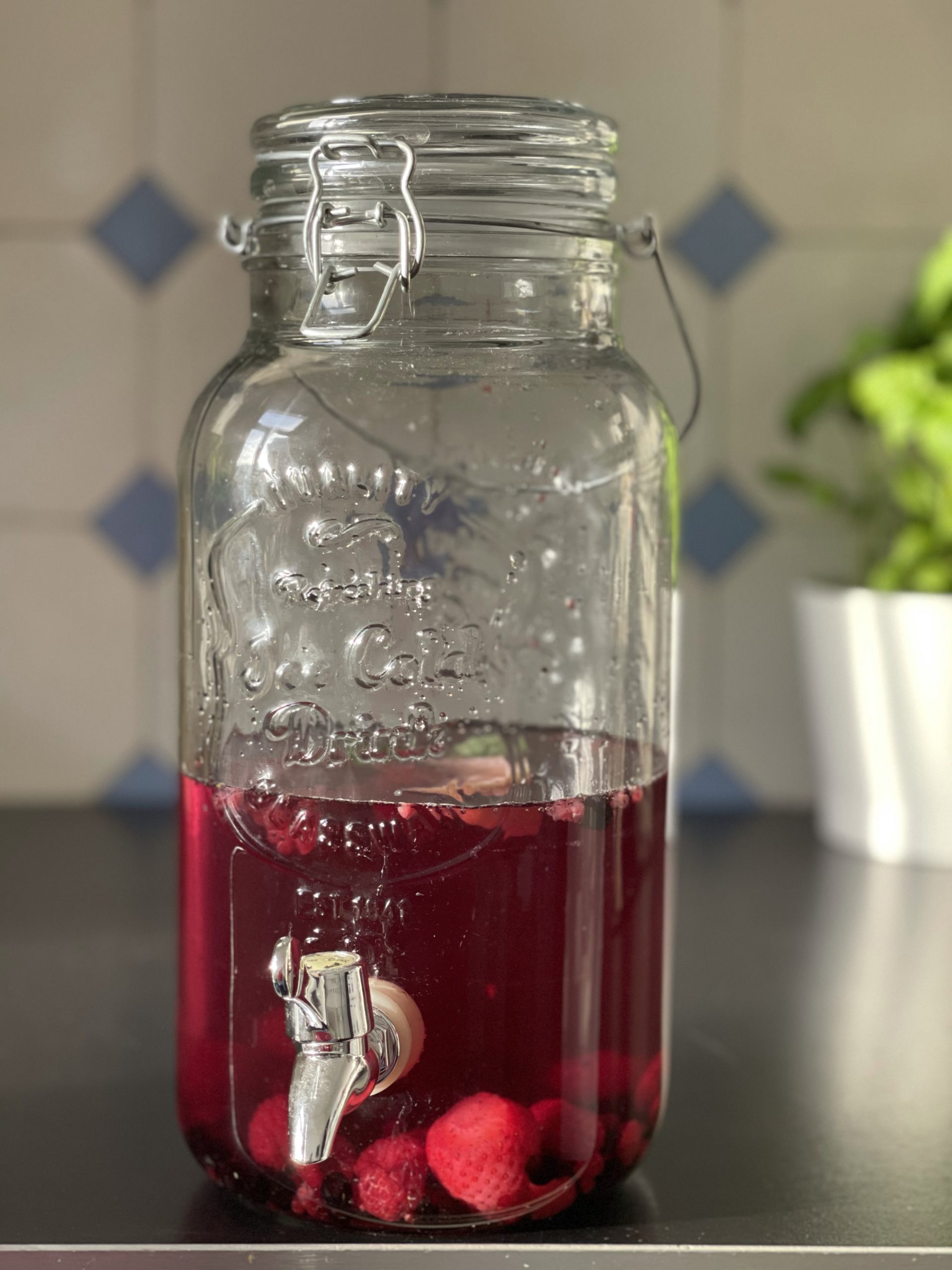 - Mit roten Früchten, Zitrone und Basilikum aromatisiertes Wasser